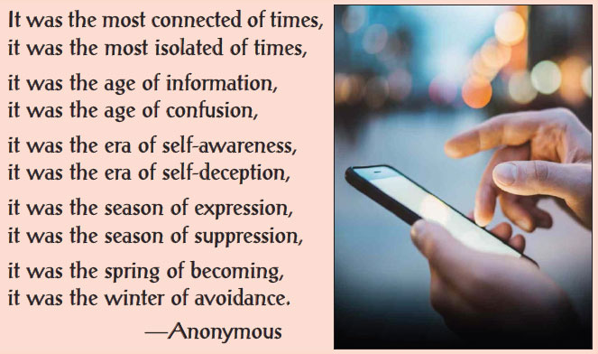 opening lines of Charles Dickens’ 1859 novel, A Tale of Two Cities: “It was the best of times, it was the worst of times, it was the age of wisdom, it was the age of foolishness, it was the epoch of belief, it was the epoch of incredulity, it was the season of light, it was the season of darkness, it was the spring of hope, it was the winter of despair.” It is still reflective of today.Now comes the modernized version of Dickens’ dichotomy.