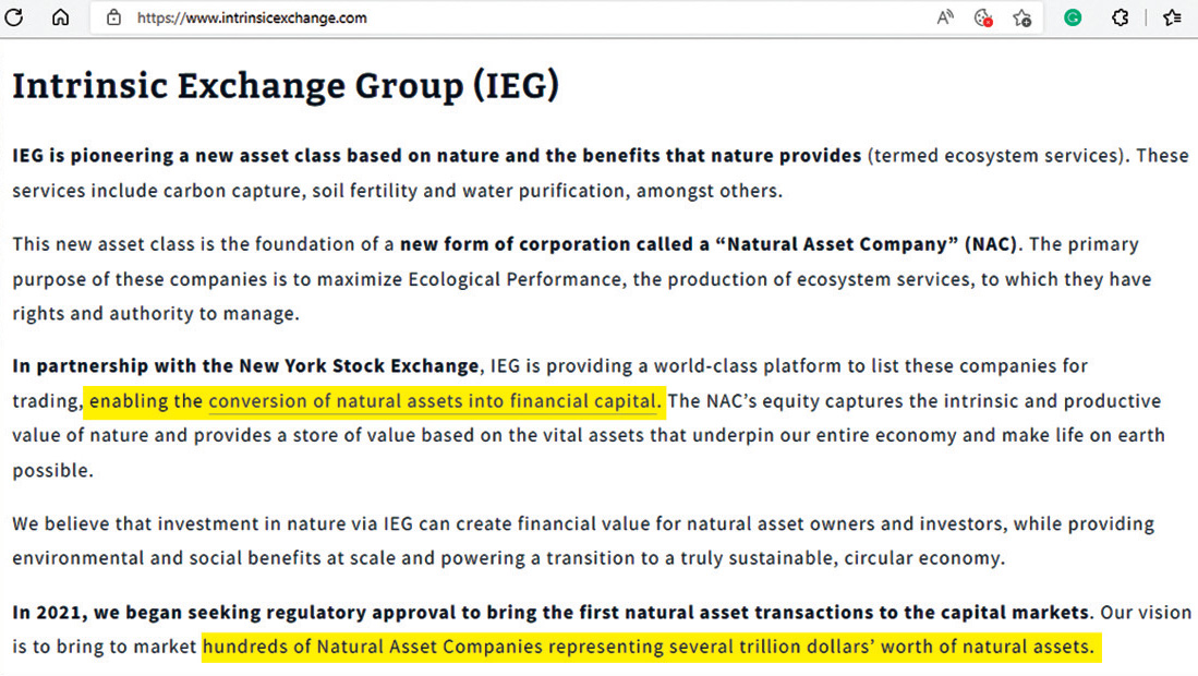 The Intrinsic Exchange Group (IEG) graphic (below, right) reveals that in 2021 regulatory approval was being sought to convert natural assets into financial capital. Let me point out the obvious: Although this brainstorm has been in the works for a decade, the conceptualizers didn’t start pressuring for approval until Joe Biden’s presidency and under the hot new campaign for the Green New Deal.