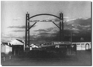 Below: Entrance to a Russian slave labor camp. The sign reads: "Work in