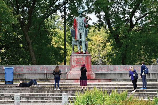 One of the many defaced statues: the Abraham Lincoln statue